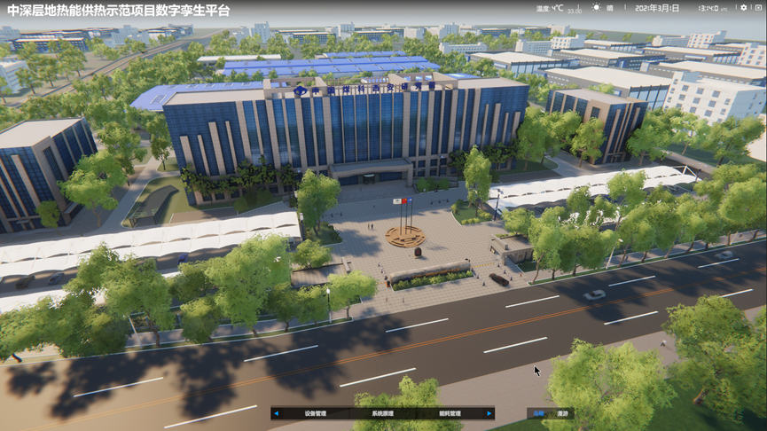 本軟件通過對中煤科工西安研究院地熱供暖泵房、主辦公樓及周邊輔助建筑物的供暖制冷需求搭建高精度1:1三維模型和工藝數學模型,通過三維可視化監控界面實現主要供暖、制冷區域的溫濕度監測,及泵房主要設備溫度、流量、壓力等運行參數監控;結合工藝數學模型仿真計算結果、提供運行控制參數合理化建議;整個系統具備歷史數據查詢、分析、能耗管理、仿真培訓、設備運行參數優化等功能,該項目的成功實施起到了推廣數字孿生平臺應用、促進兩化融合的先進示范效應。