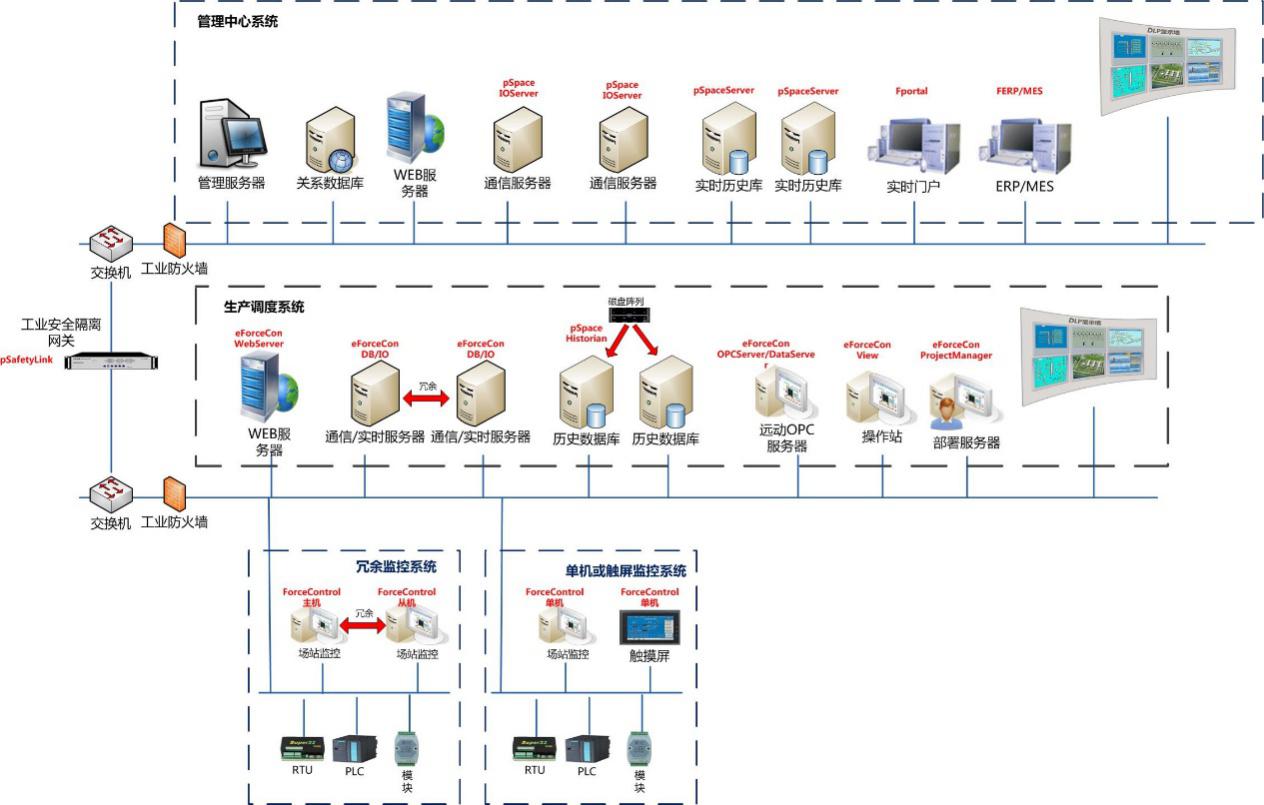 系統(tǒng)主要包括調(diào)生產(chǎn)現(xiàn)場(chǎng)監(jiān)控、生產(chǎn)調(diào)度系統(tǒng)、管理中心系統(tǒng)。生產(chǎn)現(xiàn)場(chǎng)監(jiān)控,需要配備場(chǎng)站監(jiān)控(冗余監(jiān)控系統(tǒng))和觸摸屏(單機(jī)或觸屏監(jiān)控系統(tǒng)),生產(chǎn)調(diào)度系統(tǒng)主要配備實(shí)時(shí)數(shù)據(jù)庫(kù)、歷史數(shù)據(jù)庫(kù)、遠(yuǎn)動(dòng)OPC服務(wù)器、操作員站及部署服務(wù)器等,管理中心系統(tǒng)主要配置企業(yè)級(jí)實(shí)時(shí)歷史數(shù)據(jù)庫(kù)和企業(yè)實(shí)時(shí)信息門戶;層級(jí)之間配備了隔離網(wǎng)關(guān)和防火墻等安全設(shè)備保證系統(tǒng)信息安全。
