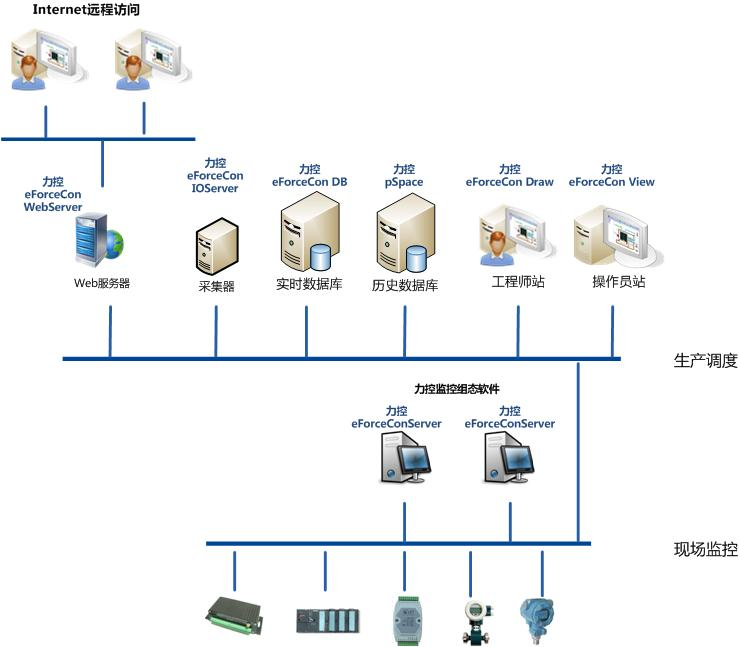 平臺采用分布式結構部署,支持B/S結構,可擴展C/S模式,與現場子系統可通過底層PLC驅動或者OPC無縫連接,以達到良好的實時性與可靠性。
