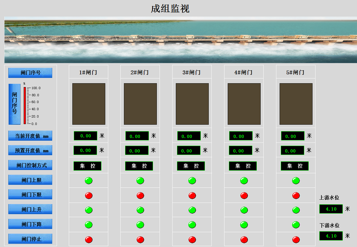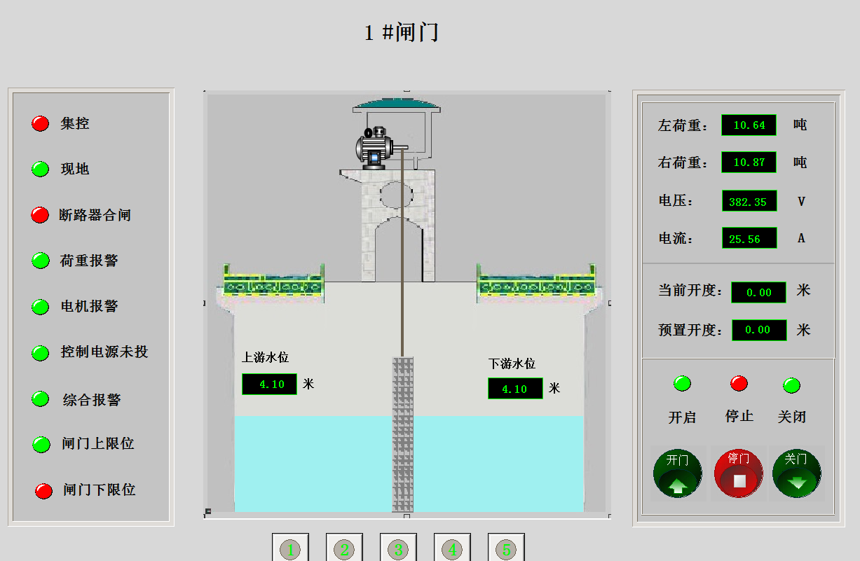 實時監(jiān)視控制閘門的狀態(tài)和數(shù)據(jù),通過開關(guān)顏色狀態(tài)查看集控,現(xiàn)地,斷路器合閘,荷重報警,電機報警,控制電源未投,綜合報警,閘門上限位,閘門下限位的開關(guān)狀態(tài),通過畫面可以查看左荷重,右荷重,電壓,電流,當(dāng)前開度實時數(shù)據(jù),通過設(shè)置預(yù)置開度調(diào)節(jié)水位,并可以開啟和關(guān)閉閘門。