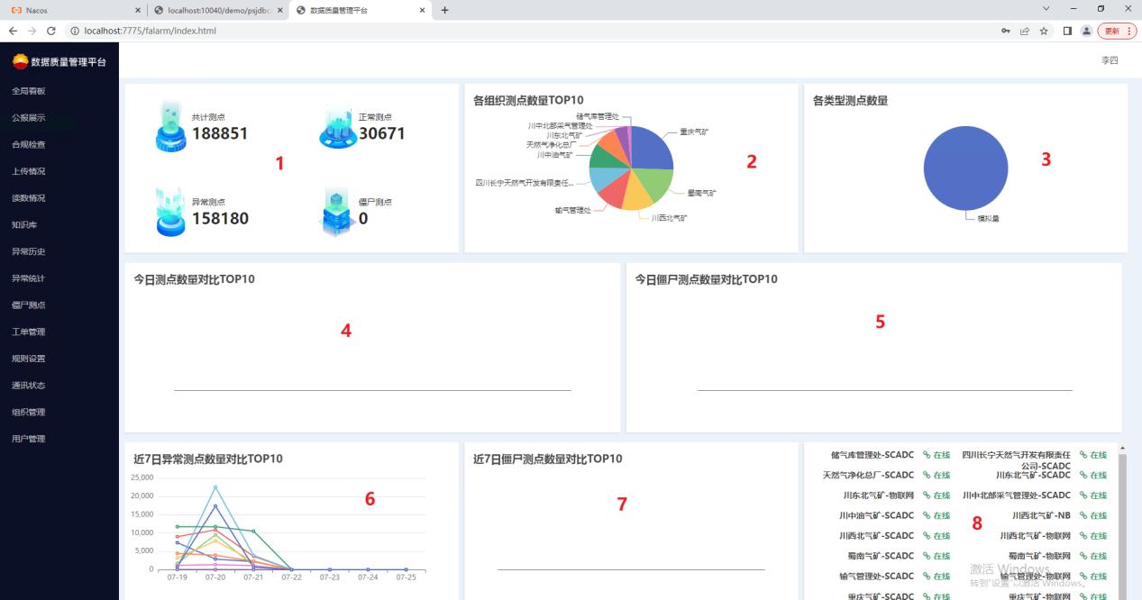 在全局看板中,能清楚的顯示出我們數據庫測點的信息。全局看板總共分為8個部分。不同權限的賬號登錄,只能看到自己權限下的測點,例如分公司權限賬號能看到數據庫所有的測點。