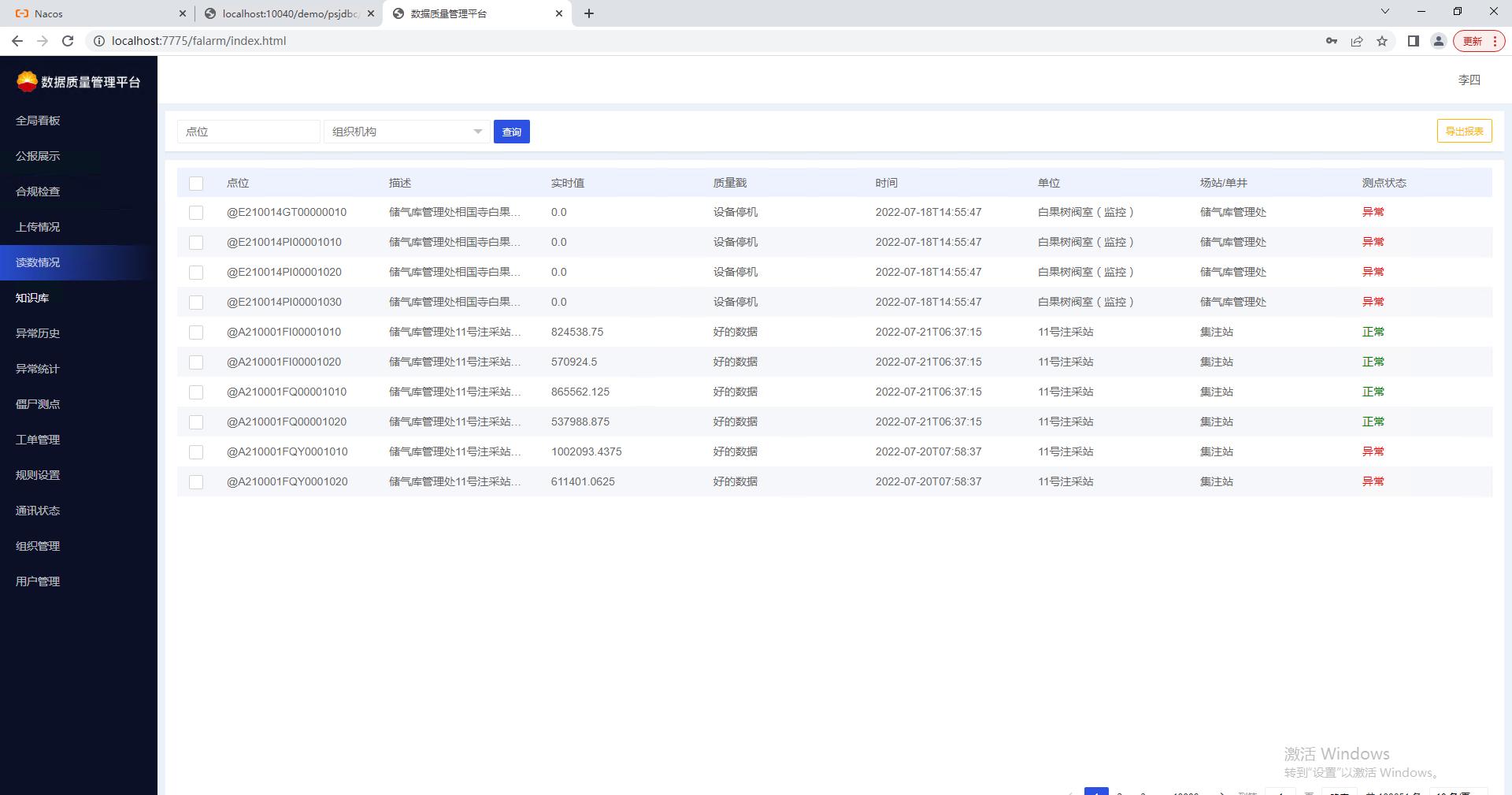 在異常統計中,總共分為9部分顯示,能清楚的顯示出我們數據庫異常測點的信息。不同權限的賬號登錄,只能看到自己權限下的測點。