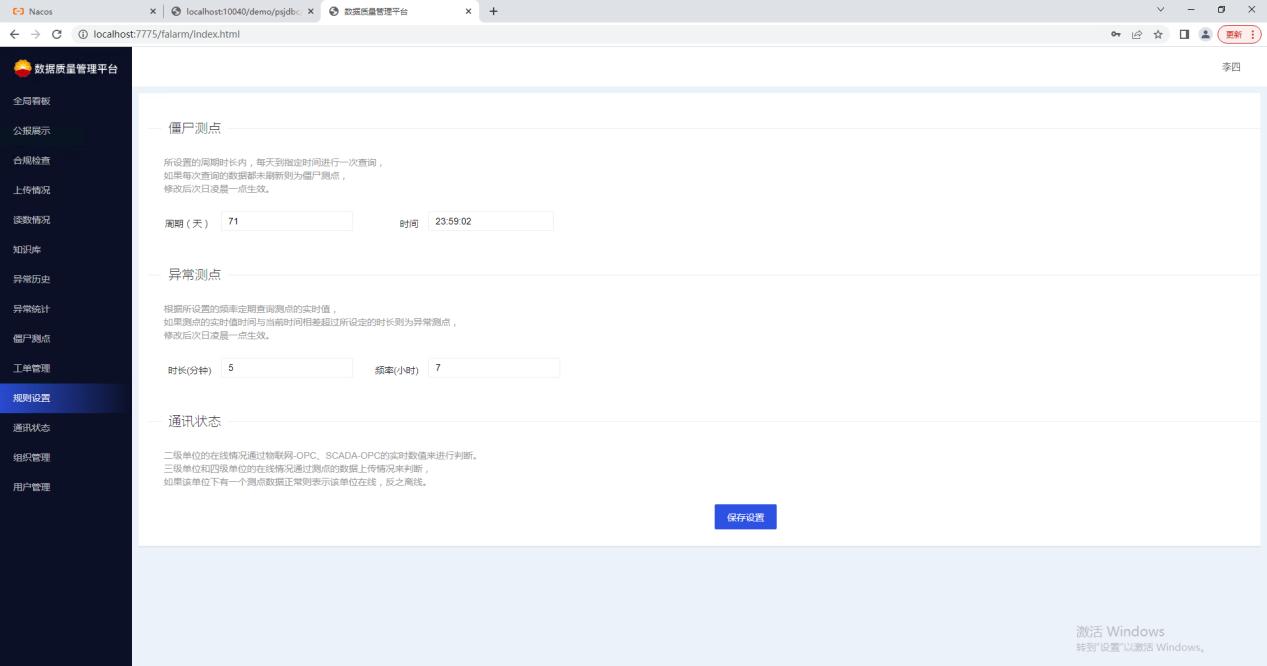 規則設置為僵尸測點、異常測點和通訊狀態的判斷規則,可在此處設置僵尸測點判斷的周期和指定時間;還可設置異常測點的指定頻率和相差時間。修改之后次日凌晨1點生效。