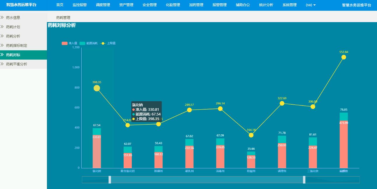 建立藥耗控制與分析系統,可根據采集的信息提前計算生產需要的碳源、PAC等藥劑的投加量,加藥前后指標變化趨勢,并進行加藥自動控制,并可分析出任意時間段內各單元的藥耗,生成日報、月報、年報??蓪崿F對藥耗生產運行成本進行分析控制和藥劑管理。對用能分類分項進行同環比分析,以棒圖、餅圖、報表等形式展示,讓用戶更直觀、快速地了解藥耗信息。