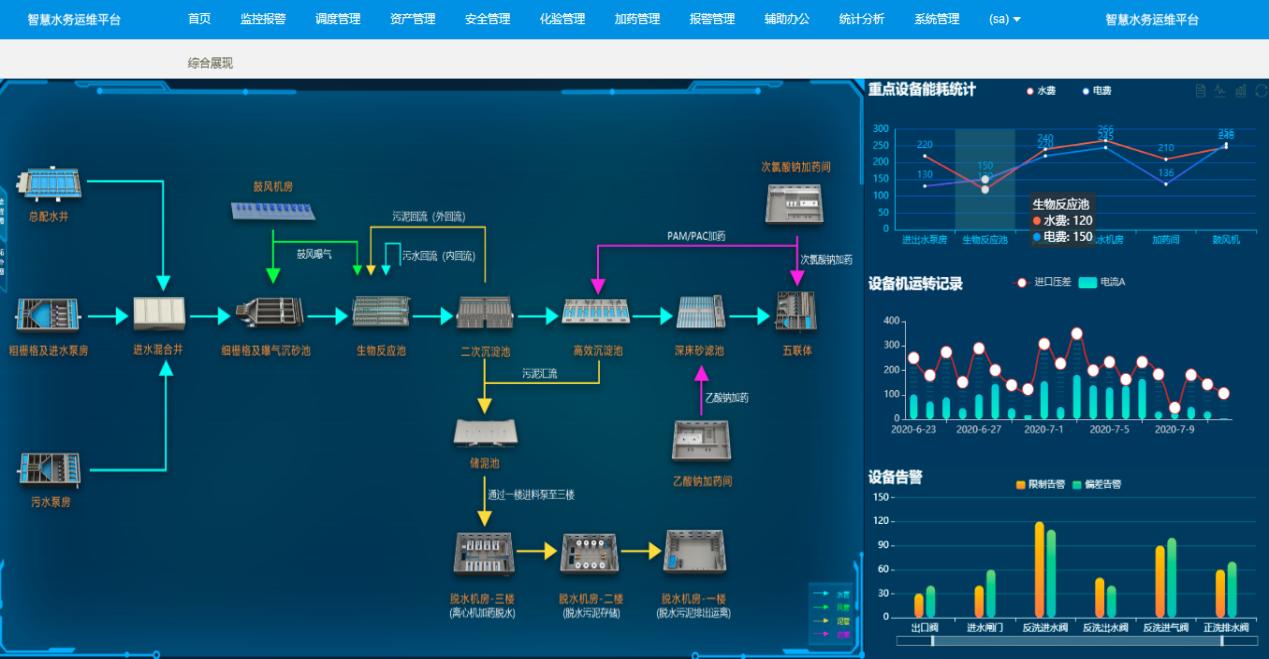 能夠通過BS瀏覽器方式顯示各類統計匯總信息,給企業的運行管理提供直觀、高效的運行監視圖,實現污水廠監視畫面集成。能夠集成污水廠SCADA、進出口處的主要數據(包括壓力、流量、液位、水質等)及其集中監視畫面。展示關鍵運行數據:包括出水數據,電耗數據,加藥數據,設備數據等; 監視畫面中設備區域可以和設備檔案之間建立鏈接,雙擊即可跳轉到對應設備臺帳信息,雙擊監視畫面中的測點,可以直接察看每個測點的歷史數據曲線。