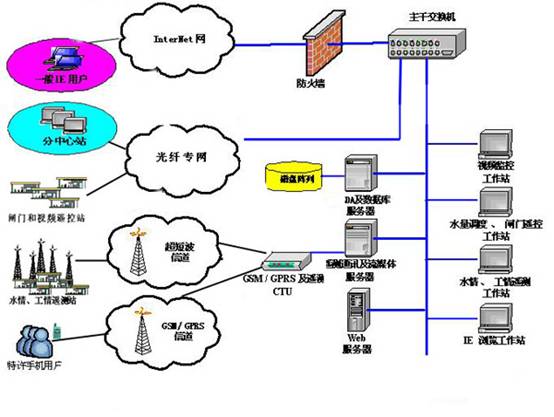 灌區信息化系統由兩級網絡組成,其中調度中心站、泵站遙控站通過開通專用光纖信道組成水利專網,傳輸遙控數據、視頻流等測控信息;各遙測站與中心站通過超短波組成無線通訊網絡,傳輸實施水情工情數據等信息。移動狀態用戶可以利用GSM網進行手機查詢和定制。在此基礎上,按照灌區管理實際需要,選擇配置成熟的應用軟件,形成以信息采集系統、灌區綜合數據庫及信息處理系統、灌區調度管理決策支持系統、灌區自動化監控系統、灌區辦公自動化系統、財務管理及水費計收系統、水務公開系統等為主的灌區管理應用系統。