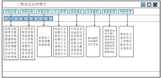 根據泵站設備工作操控流程設計為監控界面系統(主控界面、配電系統界面 、單機組界面、綜合參量界面),操控流程(配電系統、機組系統、綜合監控),日志系統、報警系統、保護系統、數據存貯系統、數據網絡發布系統,邏輯參量修正系統、控制輸出系統,查詢系統,安全維護系統,報表系統。