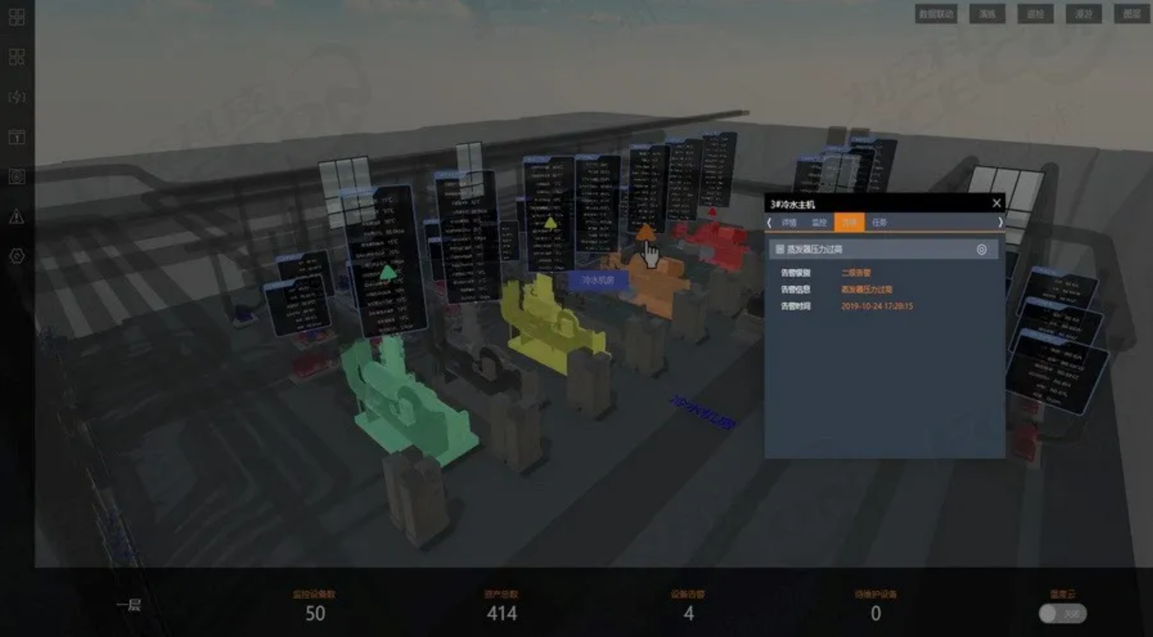 平臺能夠及時對設備發生的故障進行報警,并對接報警信息,點擊報警信息即可自動定位到設備處,快速展開相關設備的報警詳情。在三維場景中,還會在報警設備處顯示醒目報警標簽。