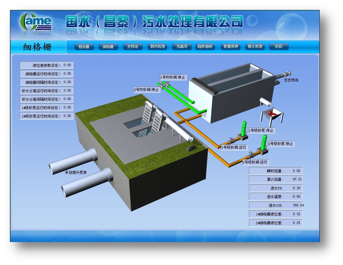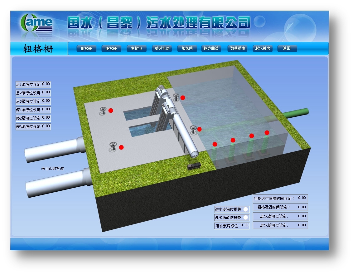 爬式粗格柵,進水經(jīng)過粗格柵間過濾一些大的固體雜質,去除那些可能對水泵有影響的無機物。需要監(jiān)測格柵水位差、進水流量、進水酸堿度、進水COD、提升泵狀態(tài)等參數(shù)。