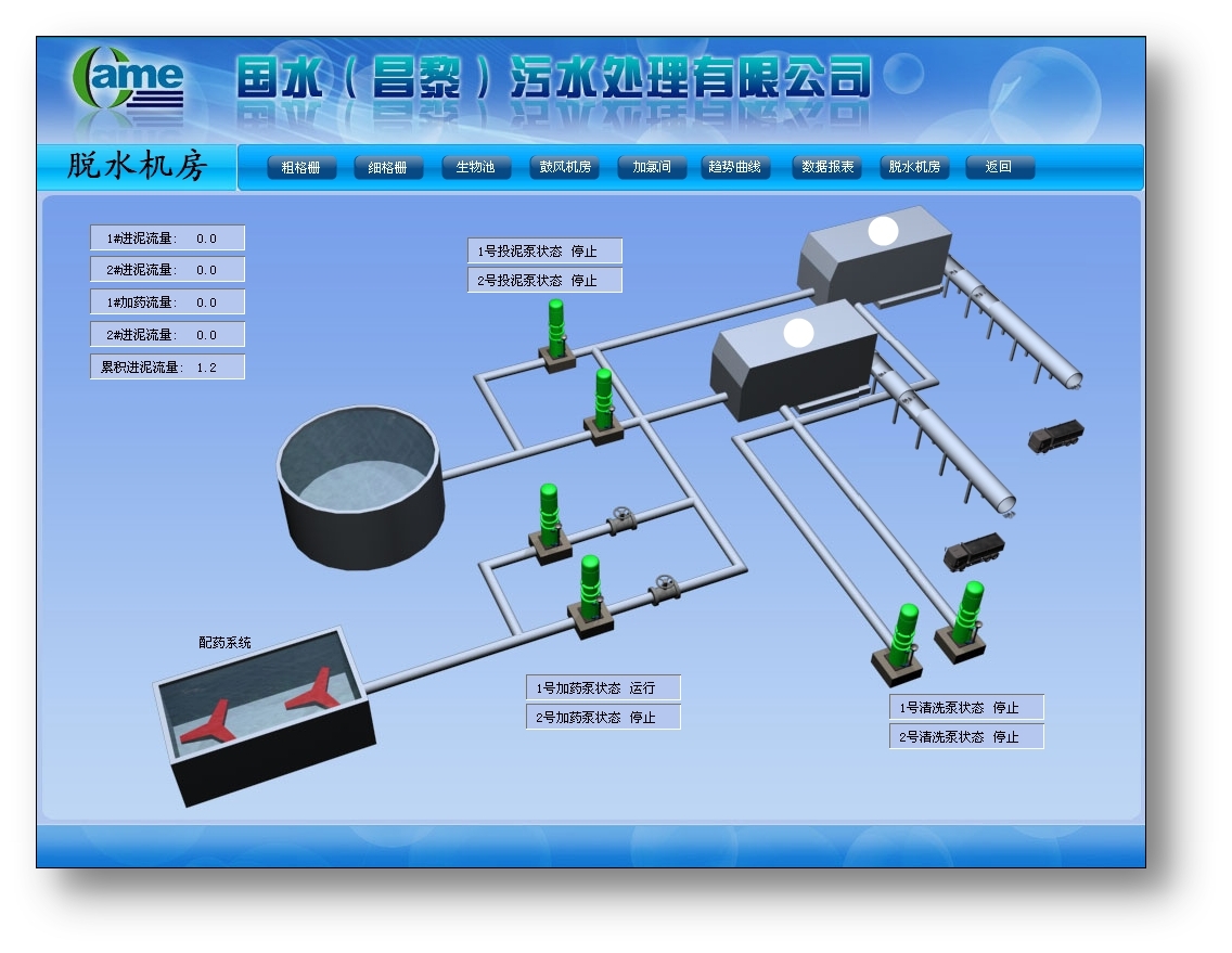 系統(tǒng)以美觀、友好的界面顯示設備運行狀態(tài)、流量、水位、COD、超聲波液位計、溶解氧計、氧化還原電位計、污泥濃度計、電磁流量計等數(shù)據(jù),并以仿真圖、直方圖、曲線圖和棒圖等多種方式清晰直觀地顯示各個敏感數(shù)據(jù),方便用戶對各敏感數(shù)據(jù)進行歷史查詢和對比分析。