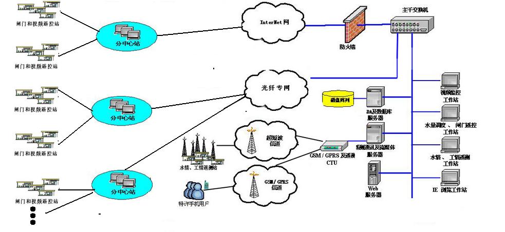 調度中心站以河道堤防管理處為中心站,承擔著計算機網絡的管理以及與上級市水利局聯網的任務。中心站對整個系統各個閘站具有管理、調度控制權,并對閘控全過程和視頻圖像進行實時監視,實現遠程遙視、遙測、遙調、遙控和“遙診”;沿堤設立的分中心站,完成對所控閘門(閘站)閘控和視頻監視,并通過網絡向調度中心傳送各閘站的信息;各工作閘站為該網絡的終端,負責對各種數據的采集以及本地手動/自動控制功能。中心站、分中心站和閘站間通過光纖或無線網絡連接。全網計算機可實時觀察各閘站閘門狀態和監視視頻圖像畫面,并可進行其他信息的傳輸和共享。