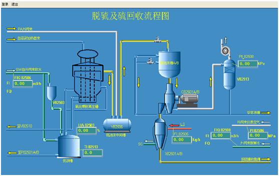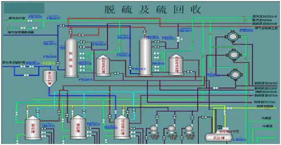 根據系統工藝需求,力控實時監控系統設計了豐富的畫面顯示,形象動態地顯示化灰系統、脫硫系統、氧化出渣系統及工藝水系統等流程,并采用不同顏色的顯示來反映各設備的運行狀態。圖3、圖4所示為脫硫及硫回收流程圖。