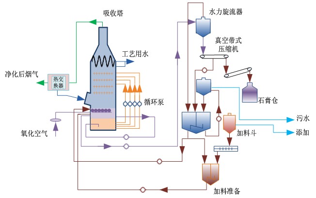 煙氣脫硫系統主要由以下各子系統組成:石灰石漿液制備系統、煙氣系統、二氧化硫吸收系統(包括漿液循環及氧化)、石膏脫水系統、工藝水系統、廢水處理系統。