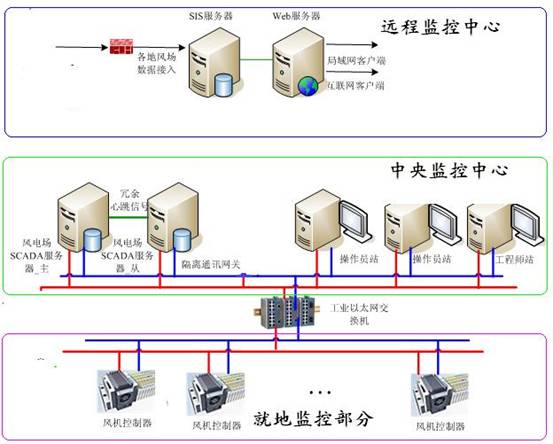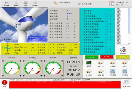 在中央控制室設立了一對互為熱備的實時數(shù)據(jù)庫服務器,采集和保存所有的現(xiàn)場數(shù)據(jù),同時作為報警服務器和事件服務器;根據(jù)需要設立一定數(shù)目的客戶端節(jié)點,作為操作員站;設立一臺工程師站作為組態(tài)和維護。風場中央監(jiān)控中心布置在風電場控制室內(nèi),工作人員根據(jù)切換畫面隨時控制和了解風電場同一型號風力發(fā)電機的運行和操作。風場監(jiān)控中心通過風電場光纖以太網(wǎng)環(huán)路與就地控制室的系統(tǒng)進行通訊。