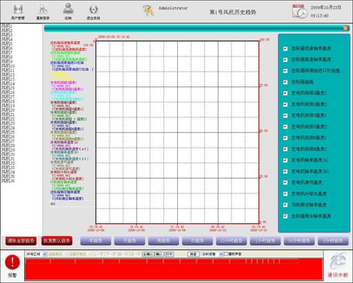 1) 系統(tǒng)的監(jiān)控畫面顯示風場所有風機、電網(wǎng)線路、以及其他設備的運行情況,重要的運行工況畫面通過一次擊鍵調(diào)出,調(diào)出時間小于0.5S;調(diào)出任何一幅畫面擊鍵不超過三次,每幅畫面能顯示過程變量的實時數(shù)據(jù)和設備狀態(tài),這些數(shù)據(jù)和狀態(tài)每秒更新一次,顯示的顏色或圖形隨過程工況而變化。系統(tǒng)提供的畫面數(shù)量、每幅畫面的圖素及實時更新和被控的過程點幾乎不受限制。系統(tǒng)提供標準的顯示畫面,如風場總覽顯示、風機列表顯示、趨勢顯示、成組顯示、棒狀圖顯示等標準畫面。