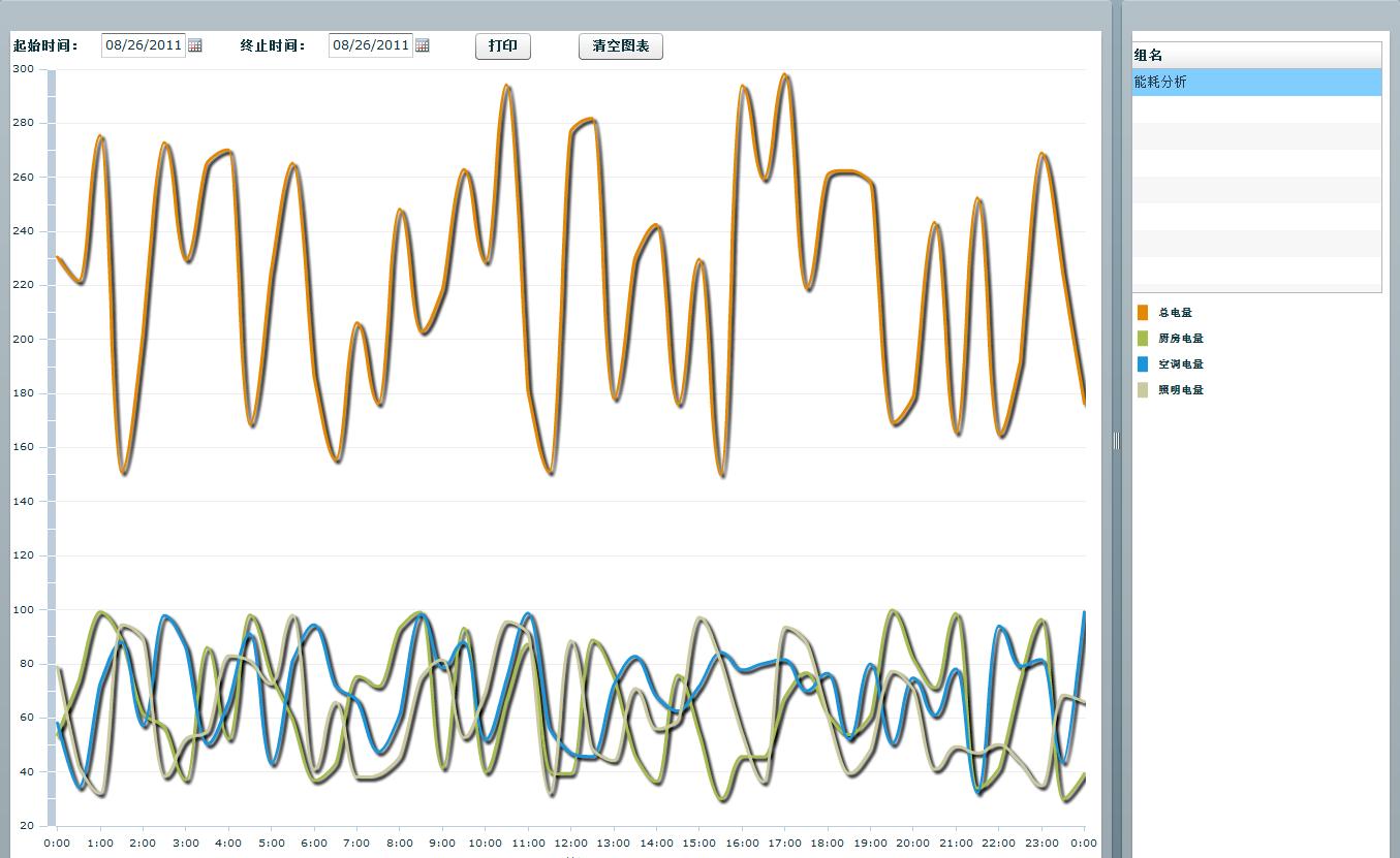 根據(jù)所選費率以及實際用電狀況,分時間段(離峰、半尖峰、尖峰)顯示用電趨勢以及用電報表。
