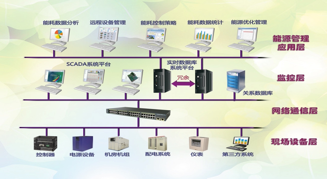 現(xiàn)場設(shè)備層:指分布于高低壓配電柜中的測控保護裝置、儀表、樓宇自控、CCTV、門禁、智能空調(diào)、UPS、電梯、變配電、消防等子系統(tǒng)。