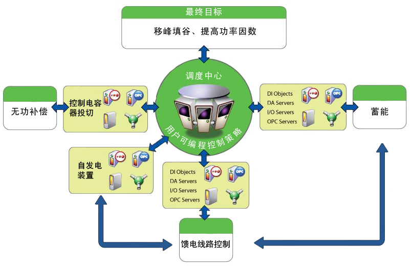 配電及能源優(yōu)化系統(tǒng)從電力專業(yè)的深度對電能消耗進行數(shù)字化和集成化的管理、控制和優(yōu)化。系統(tǒng)與無功補償裝置聯(lián)動提高功率因數(shù),通過與自發(fā)電裝置(如太陽能發(fā)電裝置或其他類型發(fā)電裝置)、蓄能裝置的聯(lián)動與交互,完成饋電線路控制,實現(xiàn)移峰填谷。