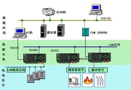 硬件選用德國GMC公司的產品搭建系統(tǒng):數據總站選用U1601,6個采集點的模擬量直接連接到U1601的6個模擬量輸入口。將U1601數據總站兩個RS232接口的其中一個連接一個COM SERVER, 將數據總站輸出的數據轉化為局域網上可傳輸的數據,然后送到局域網上的PC機里進行數據的統(tǒng)計、分析和處理,利于有關人員查看和利用。如圖: