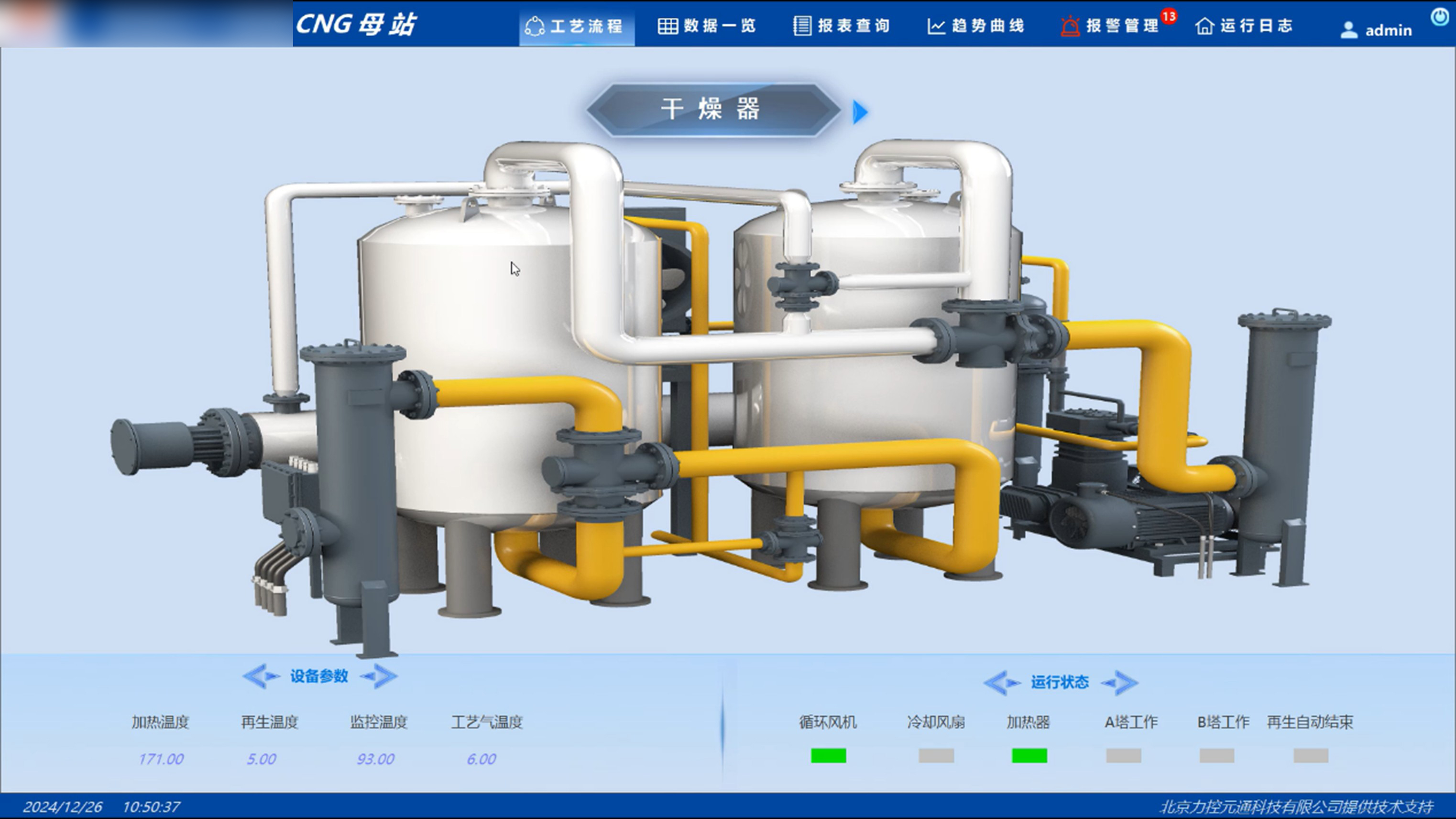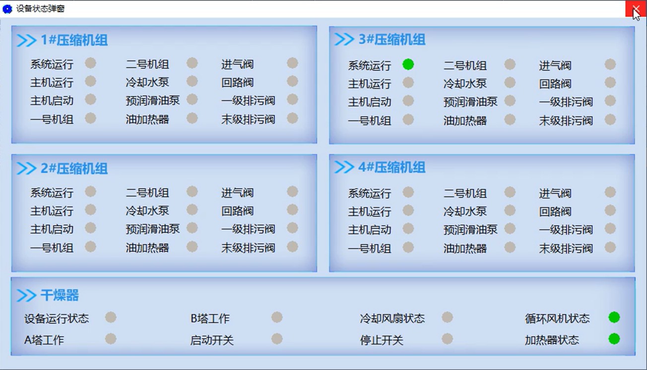 設(shè)備數(shù)據(jù)采用雙維度展示,既可通過總覽表格集中呈現(xiàn)壓縮機(jī)、干燥器等核心設(shè)備的溫度參數(shù)(加熱/再生/工藝氣溫度)及部件狀態(tài)(風(fēng)機(jī)/風(fēng)扇/塔工作狀態(tài)),也可切換至單設(shè)備專屬頁面查看詳情。