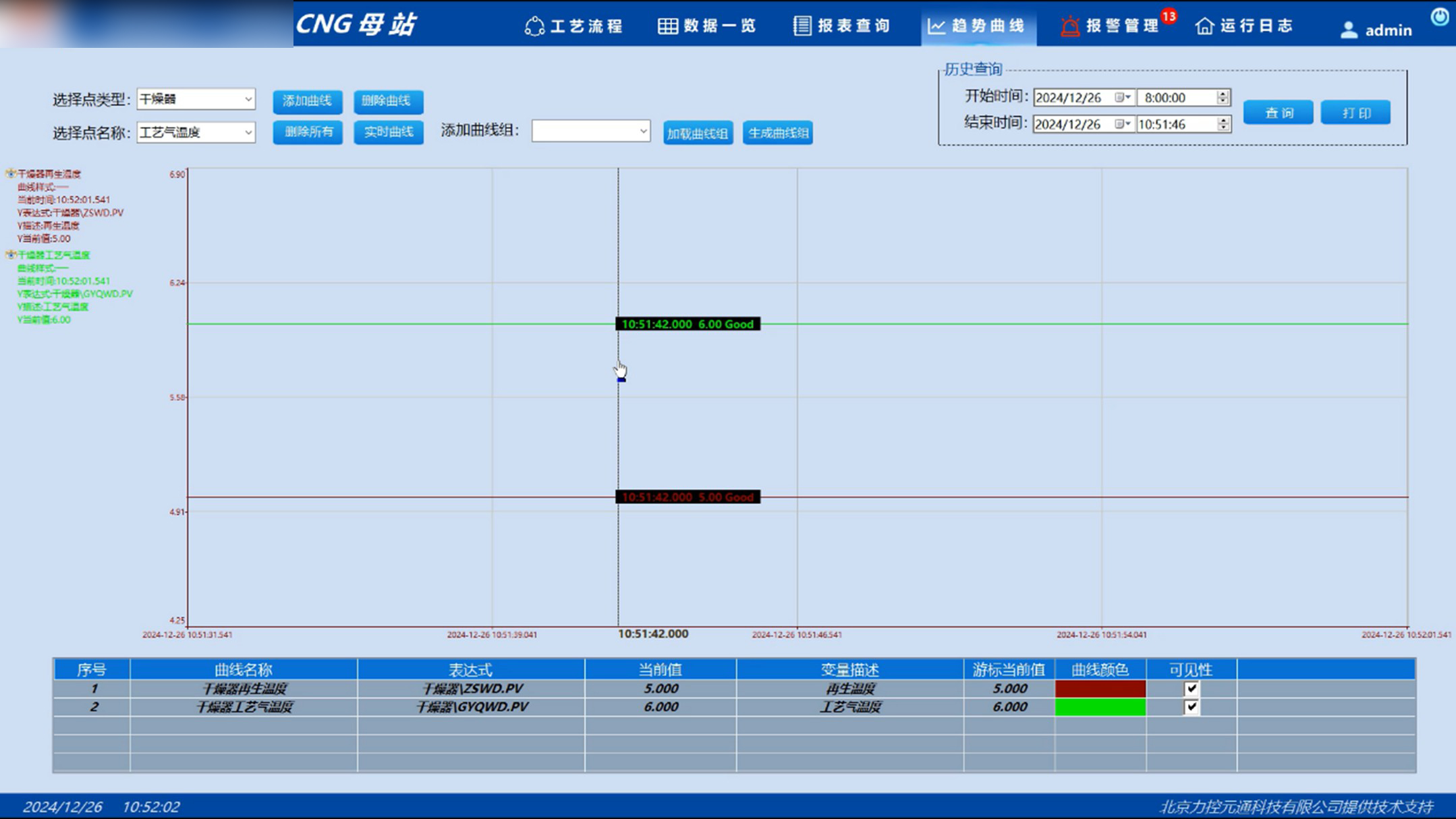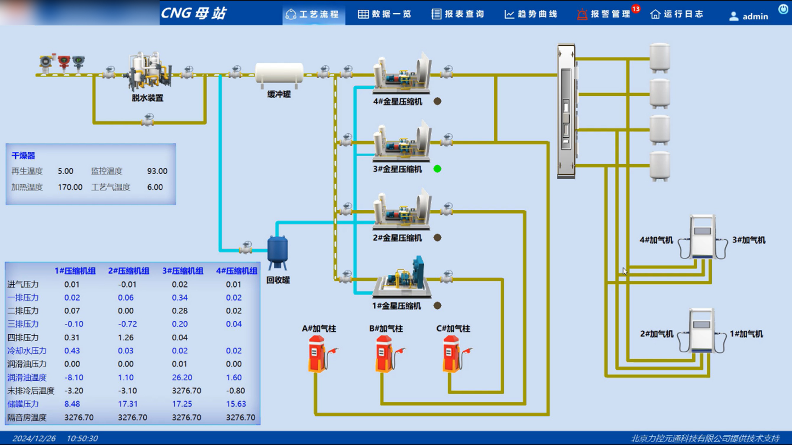 工藝流程模塊動態(tài)展示氣體從進(jìn)站到加注的全過程,實時顯示設(shè)備啟停狀態(tài)、模擬量變化及氣體流向,支持點擊設(shè)備調(diào)取工藝參數(shù)文本框及趨勢曲線分析。