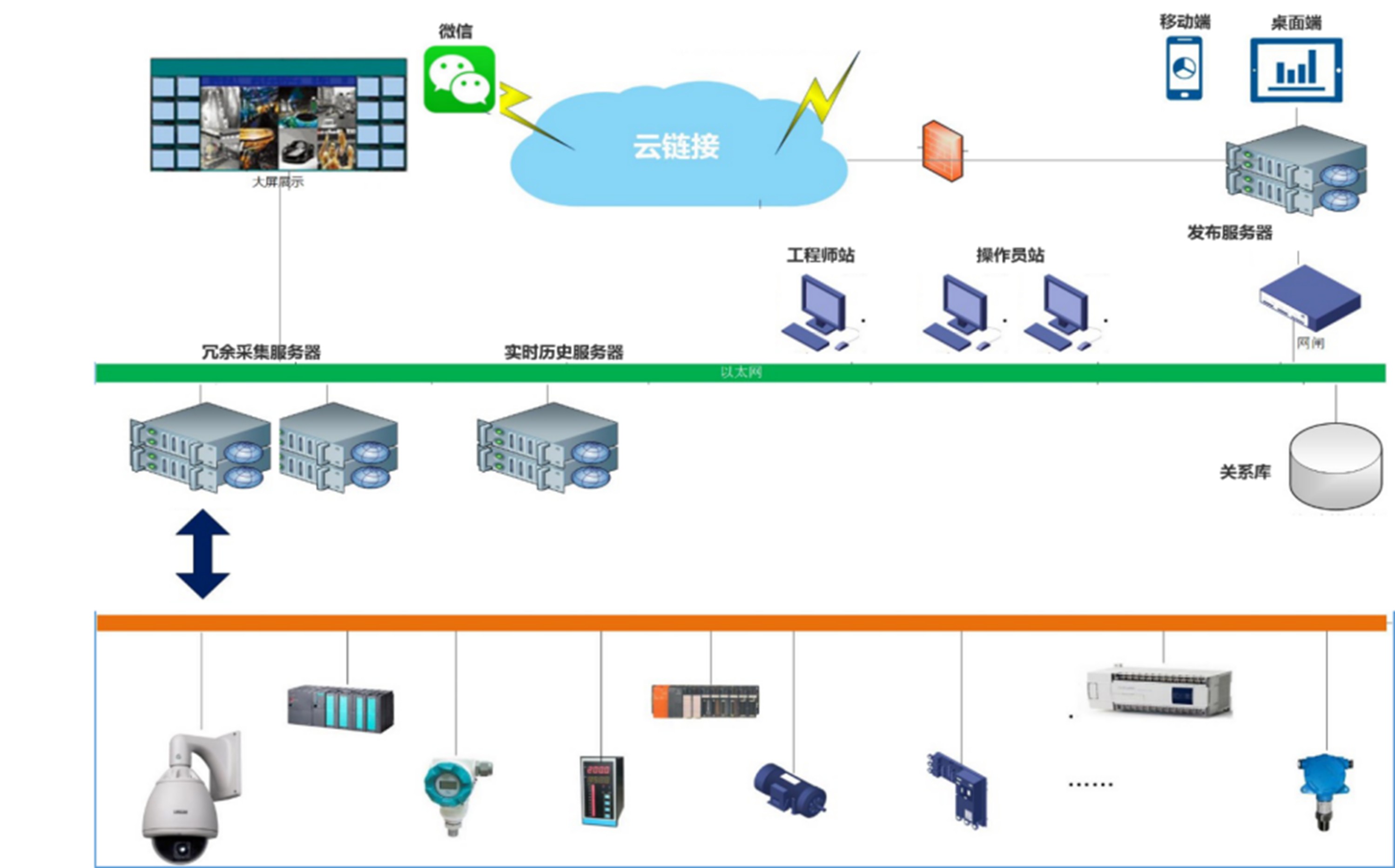 綜合監控層基于工業環網傳輸數據,部署SCADA系統與數據庫軟件,實現實時數據計算、存儲及歷史數據分析功能。通過動態監測各子系統安全生產狀態,構建可視化監控體系,支持調度中心大屏、子站客戶端及WEB端多方式訪問,為管理人員與技術團隊提供精準、直觀的設備運行信息,助力科學決策與風險預判。