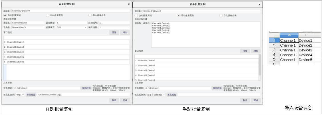 手動復制準確全面:用戶可根據特殊場景的實際需求,手動輸入通道和設備名稱,逗號分隔,不同設備使用分號分隔。因此用戶能夠靈活全面的掌握復制的內容,實現準確的批量復制操作。