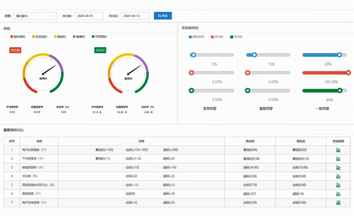 針對各裝置報警優先級、報警次數進行詳細統計和比對,分析各生產單元平均報警率、峰值報警率、擾動率、擱置率、確認率、恢復率等指標,深度評估各裝置報警情況,提升報警管理水平;