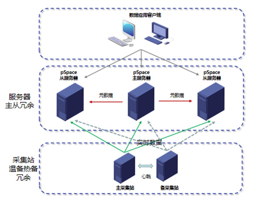 主從冗余:主服務器的元數據主動同步到從服務器,保證主從服務器工程一致性;實時數據都來自采集站,保證實時數據一致性;斷線緩存功能確保數據的完整性;采集站冗余保證采集數據不丟失。