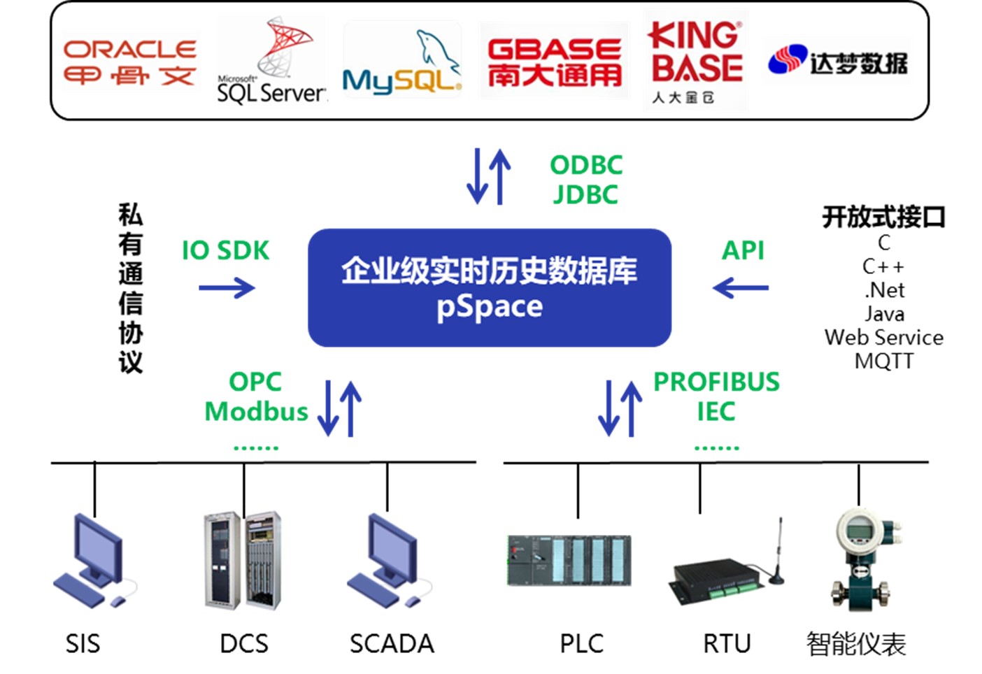 對于數據量大、性能要求高、應用靈活的應用場景,pSpace提供API、ODBC、JDBC、Web Service、MQTT等豐富接口方式。