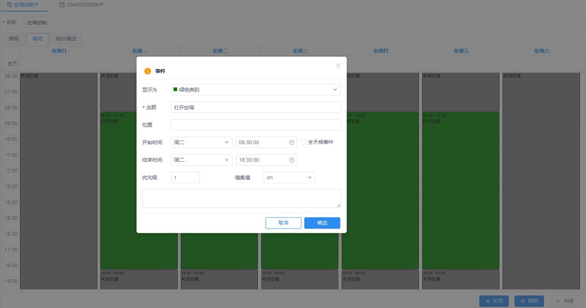 空調(diào)系統(tǒng):結(jié)合樓宇內(nèi)外環(huán)境參數(shù)(如溫度、濕度、人員密度等),可通過時間調(diào)度表智能調(diào)整空調(diào)運行狀態(tài),確保室內(nèi)環(huán)境舒適,同時降低能耗。