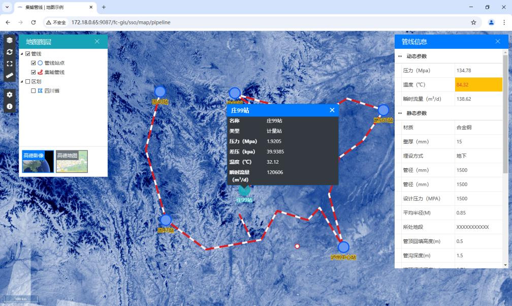 力控在線 GIS 基于先進(jìn)的技術(shù)架構(gòu),可依據(jù)用戶授權(quán)獲取的在線地圖資源,靈活開展二次組態(tài)工作。在地圖上,不僅能夠依據(jù)經(jīng)緯度精準(zhǔn)實(shí)現(xiàn)可視化站點(diǎn)標(biāo)注、細(xì)致完成管線繪制,還能實(shí)時(shí)展示具體標(biāo)注項(xiàng)的動態(tài)數(shù)據(jù),全方位呈現(xiàn)生產(chǎn)現(xiàn)場的實(shí)時(shí)信息。