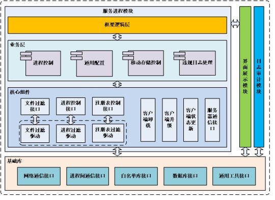 分為三個(gè)獨(dú)立的程序模塊,分別為:服務(wù)進(jìn)程模塊、界面展示模塊、日志審計(jì)模塊。服務(wù)進(jìn)程為系統(tǒng)實(shí)現(xiàn)的核心模塊,系統(tǒng)所有的功能均由主服務(wù)進(jìn)程來實(shí)現(xiàn);界面展示模塊負(fù)責(zé)用戶交互;日志審計(jì)模塊負(fù)責(zé)日志的查詢及統(tǒng)計(jì)。