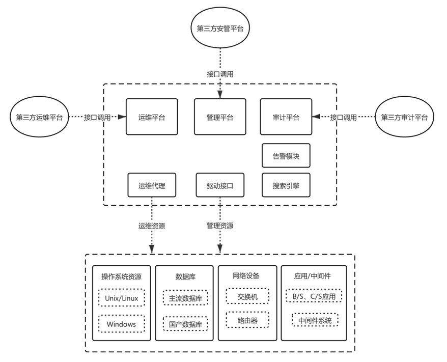 華康安全運(yùn)維管理系統(tǒng)按照業(yè)務(wù)劃分為三個(gè)平臺(tái)分別是運(yùn)維平臺(tái)、管理平臺(tái)和審計(jì)平臺(tái)。三個(gè)平臺(tái)對(duì)外可分別提供三個(gè)接口用于第三方平臺(tái)管理系統(tǒng),目前暫未對(duì)外開放,后續(xù)會(huì)提供標(biāo)準(zhǔn)接口。內(nèi)部的運(yùn)維代理負(fù)責(zé)連接資源,在會(huì)話中負(fù)責(zé)訪問(wèn)控制和審計(jì)。驅(qū)動(dòng)接口負(fù)責(zé)對(duì)資源賬號(hào)進(jìn)行維護(hù),包括改密、鎖定、授權(quán)、增加、刪除等操作。