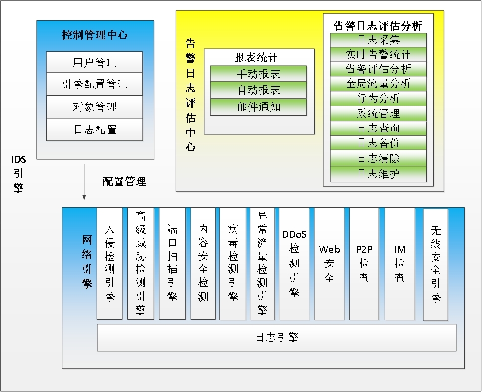 告警日志評估中心完成日志數據采集、告警實時統計和顯示、告警事后評估分析和全局流量分析、日志查詢、備份、清除、維護以及安全報表等功能。