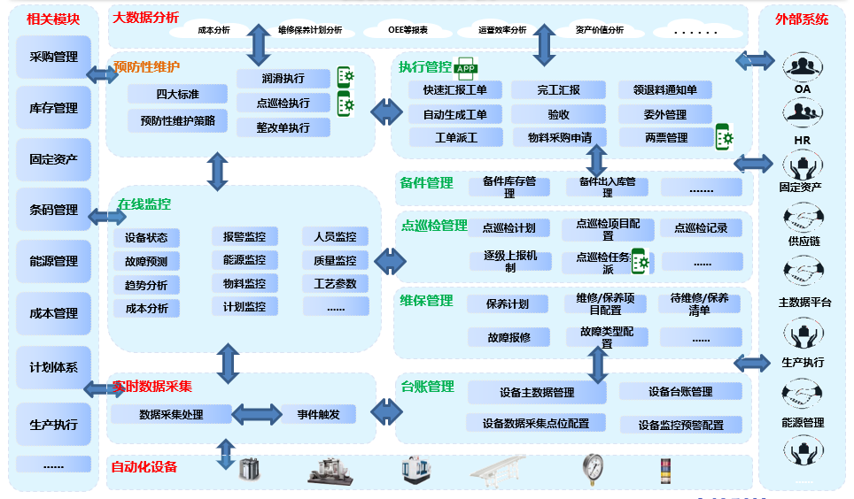 提供設(shè)備維修、保養(yǎng)、點(diǎn)檢、預(yù)警等功能,實(shí)現(xiàn)設(shè)備全生命周期的管控