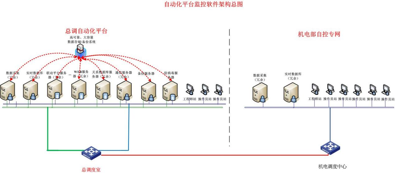 數據的實時采集是智能監控系統的核心,為了保證控制的安全與可靠,系統采用集控加分控的方式。SCADA采集服務器采用冗余熱備的方式進行采集,緩存數據自動上傳到實時數據庫中,進一步保證了控制與監測的安全可靠。