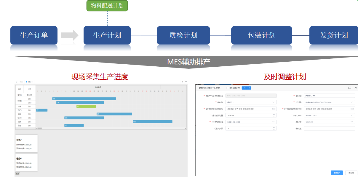 可視化管理MES 系統(tǒng)接收頂層 ERP下發(fā)的生產計劃,通過排產算法結合管理者的意愿、其他信息系統(tǒng)的數據、和當前物料信息、設備狀態(tài)等關鍵信息,分解成生產計劃并生成對應工位的詳細工單,指導生產。