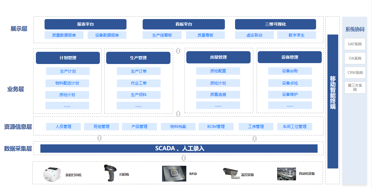 通過對工廠數據進行集中的收集、分析和統計,為企業提供各種可視化管理報表和看板,運用工業平板、手機、PDA等移動端遠程操作和查看,真正實現線上的智能化工廠管理。