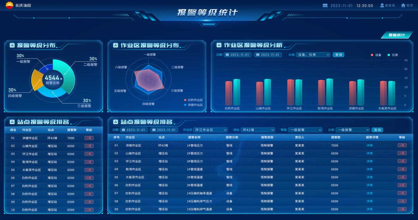 報(bào)警平臺(tái)實(shí)現(xiàn)各類報(bào)警數(shù)據(jù)統(tǒng)一接入平臺(tái),實(shí)現(xiàn)集中查看、集中管理,針對(duì)中心站、作業(yè)區(qū)、氣礦等各個(gè)層級(jí)的報(bào)警分析,根據(jù)業(yè)務(wù)需要可自由查看每一級(jí)組織機(jī)構(gòu)的報(bào)警數(shù)據(jù)。同時(shí),基于報(bào)警合理化分析,可有效減少一線人員的報(bào)警量,提高調(diào)度人員的工作效率,為下一步“少人值守”奠定的信息基礎(chǔ)。