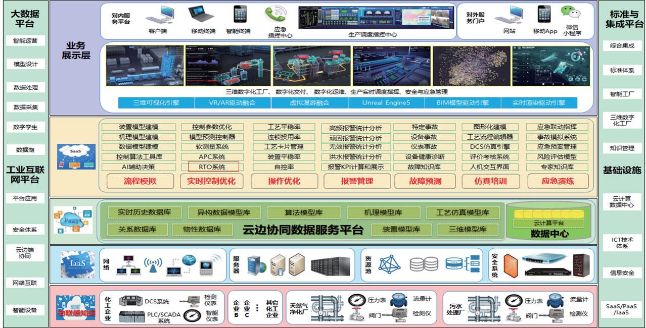 構(gòu)建企業(yè)云邊端協(xié)同數(shù)據(jù)服務(wù)平臺(tái),通過物聯(lián)網(wǎng)關(guān)和協(xié)議轉(zhuǎn)換采集DCS系統(tǒng)、SCADA系統(tǒng)和PLC系統(tǒng)等生產(chǎn)數(shù)據(jù)和工藝數(shù)據(jù),同時(shí)集成基礎(chǔ)原料和產(chǎn)品的質(zhì)化驗(yàn)數(shù)據(jù),設(shè)備靜態(tài)數(shù)據(jù)以及其與生產(chǎn)裝置有關(guān)的其它數(shù)據(jù),為應(yīng)用層提供數(shù)據(jù)服務(wù)和支撐作用。